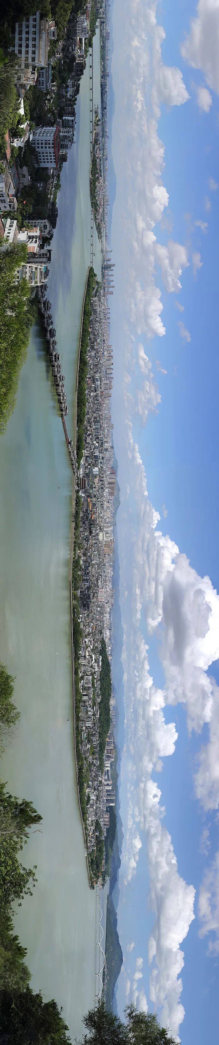 潮州山川秀美,风光绮丽,北枕群山,南濒大海,韩江一水似带穿城而过,金山、葫芦山、笔架山三山为屏,构成了一幅绿水青山护城廓的秀丽图景。